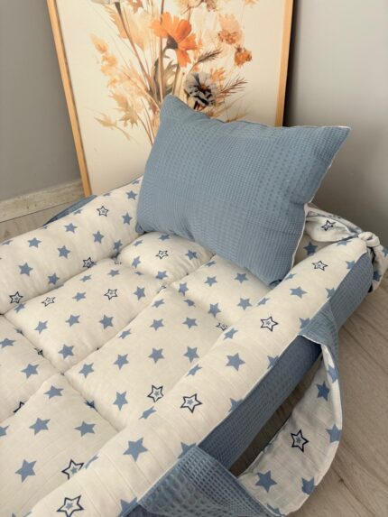%100 Pamuk Çift Katlı Çift Kullanımlı Anne Yanı Yatağı [ Mavi Yıldız ]