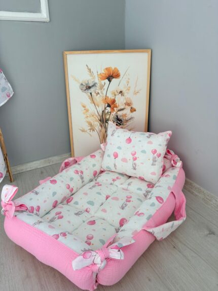%100 Pamuk Çift Katlı Çift Kullanımlı Anne Yanı Yatağı(Şeker Desen Müslin Pembe Pike)